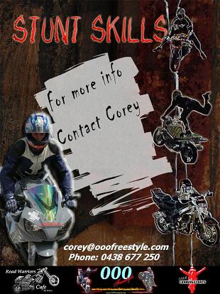 When: The last StuntSkills was held on Sunday 4th of October, 2009 at Oran Park, NSW. Where: With Oran Park being bulldozed to make way for a new housing development, StuntSkills will be put on hold a new suitable location can be found. If you have any ideas, please contact Corey on 0438 677 250. Why: This gives riders at all levels somewhere that's safe and legal to ride Who: This event is open to all bikes and all riders of all ages regardless of their skill level. We have experienced riders on hand throughout the day to offer advice. The event is limited to 30 riders so be sure to book early. Drivers licence or bike registration is not required. Cost: $120 if payment is received 4 weeks before the event or $150 if you don't meet the deadline which can be paid in cash on the day. This includes two cold drinks supplied on the day and a cooked breakfast or lunch. Requirements: All riders must wear: